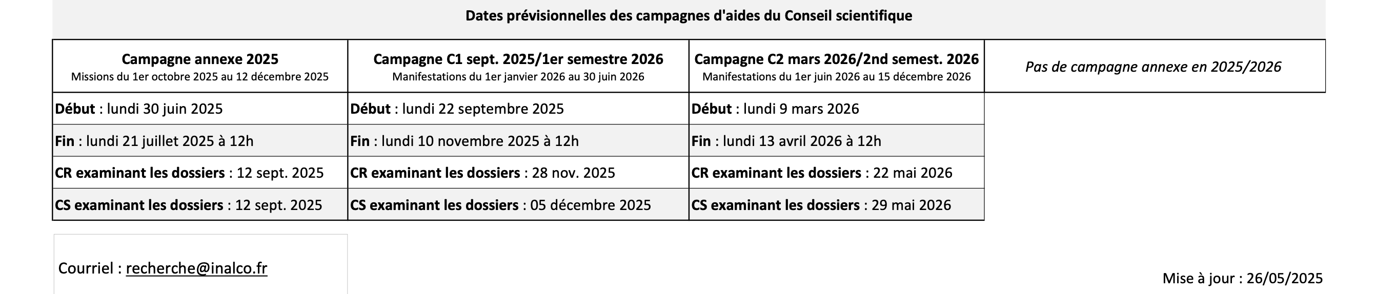 - les activités scientifiques porteront sur la période du 1er janvier 2026 au 30 juin 2026